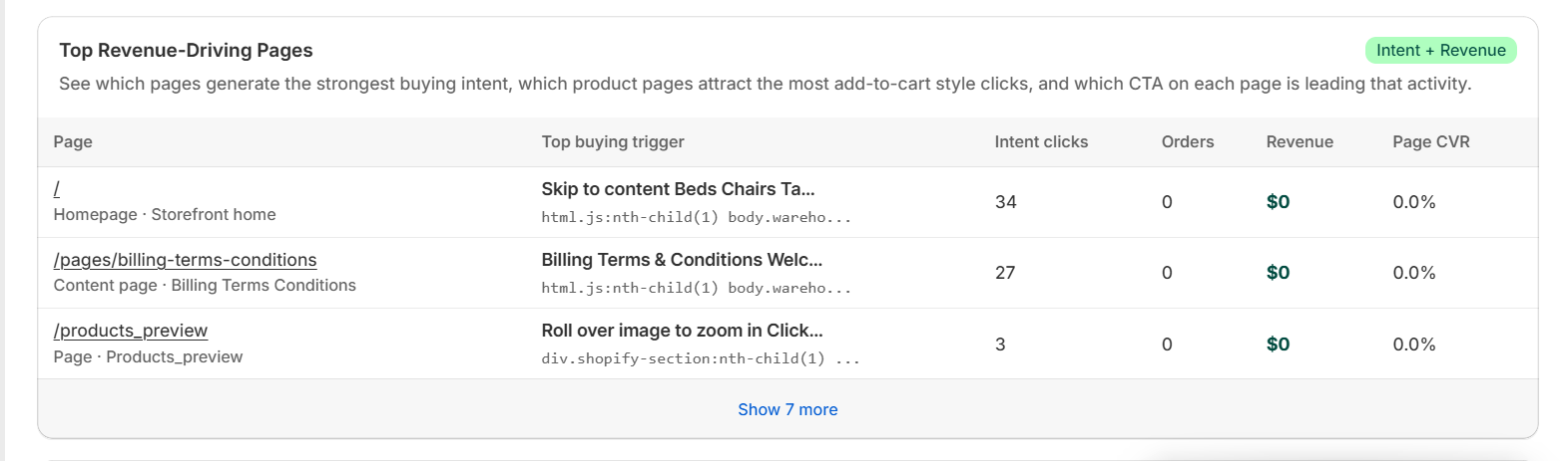 Top Revenue-Driving Pages shows which pages are creating the strongest buying intent, how many intent clicks they generate, how many orders follow, how much revenue is attributed to them, and which trigger on that page is doing the heavy lifting.