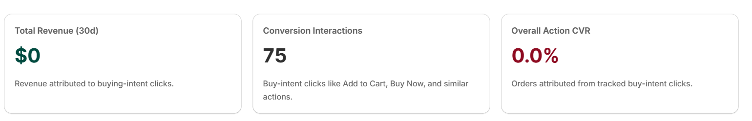 "Conversions shows which tracked buying-intent interactions are driving orders and revenue, helping users identify high-value pages, strong triggers, and weak CTAs that need improvement."