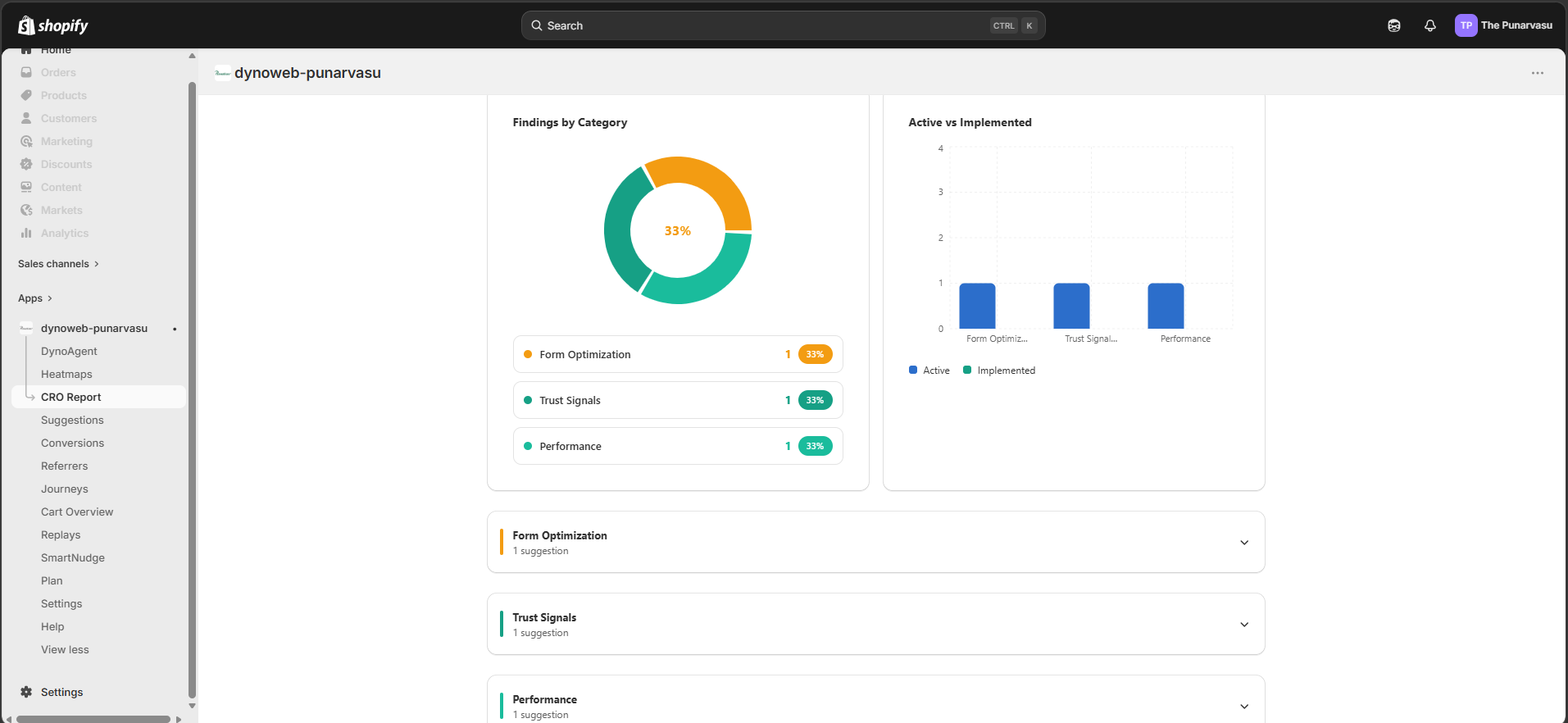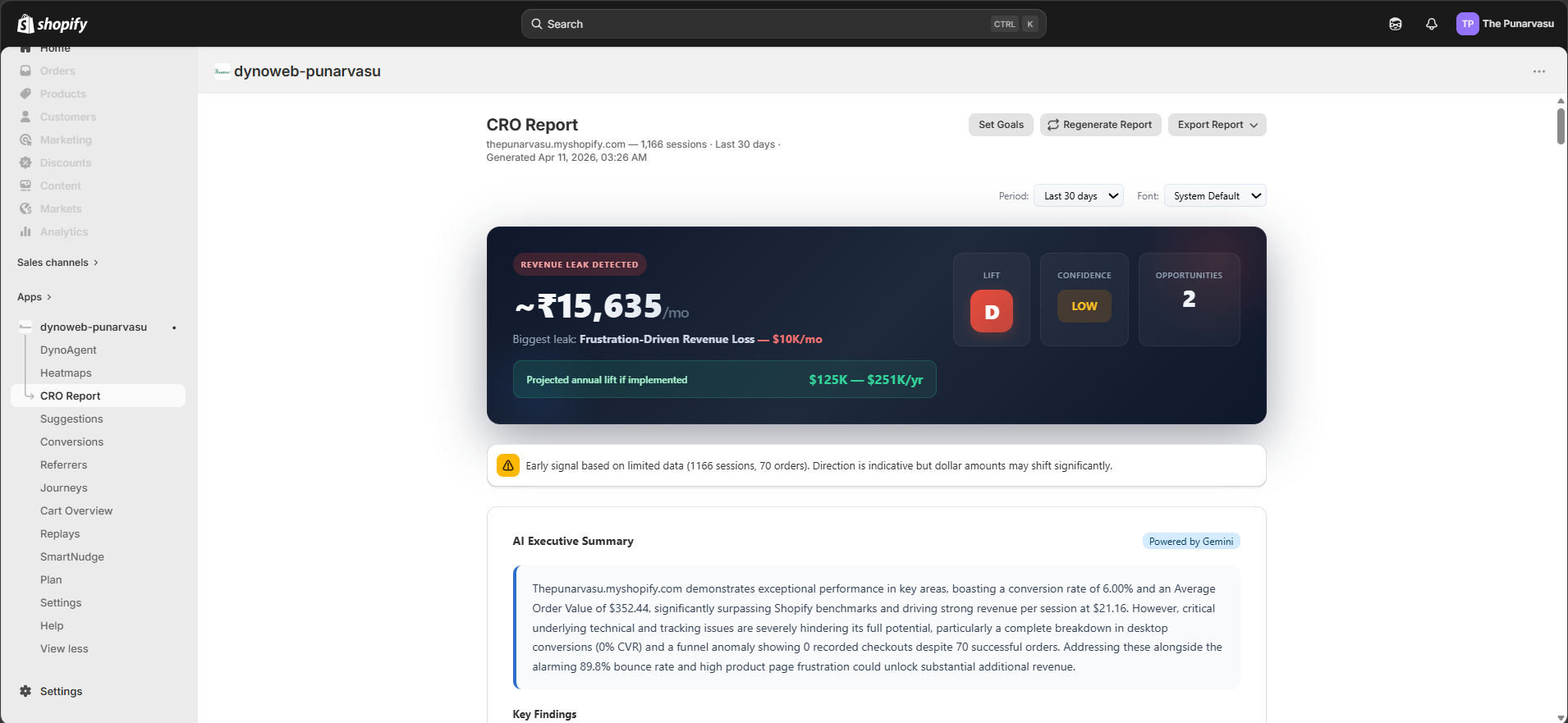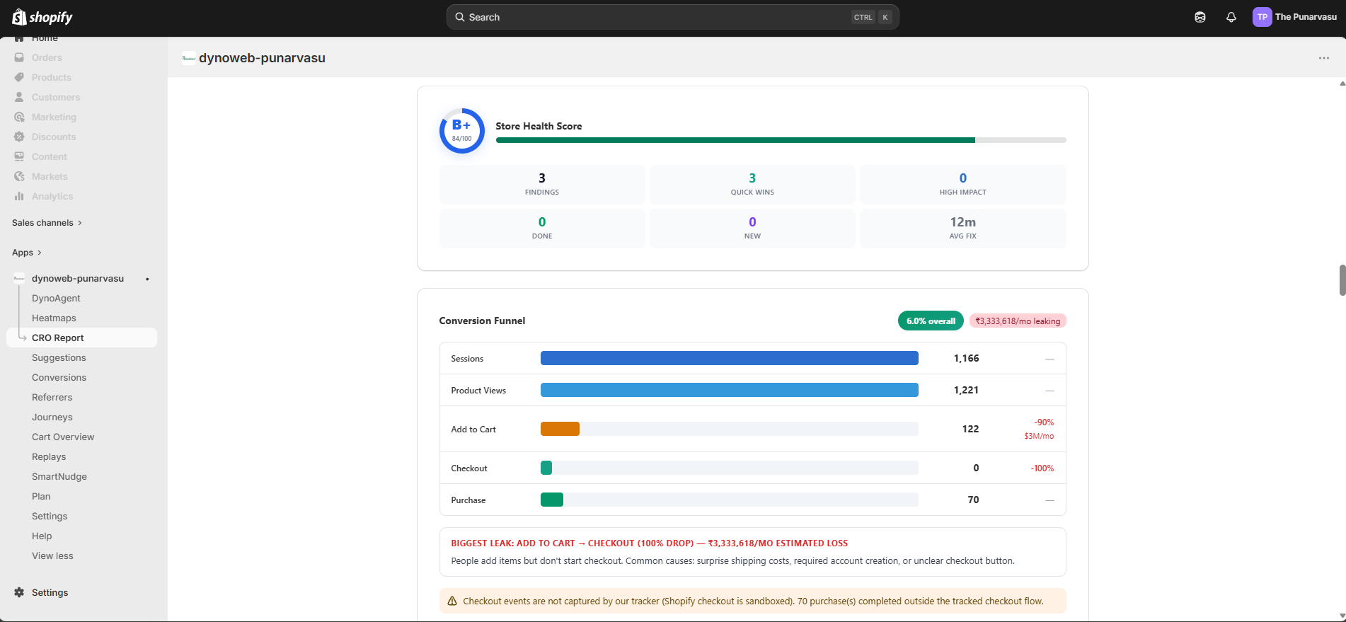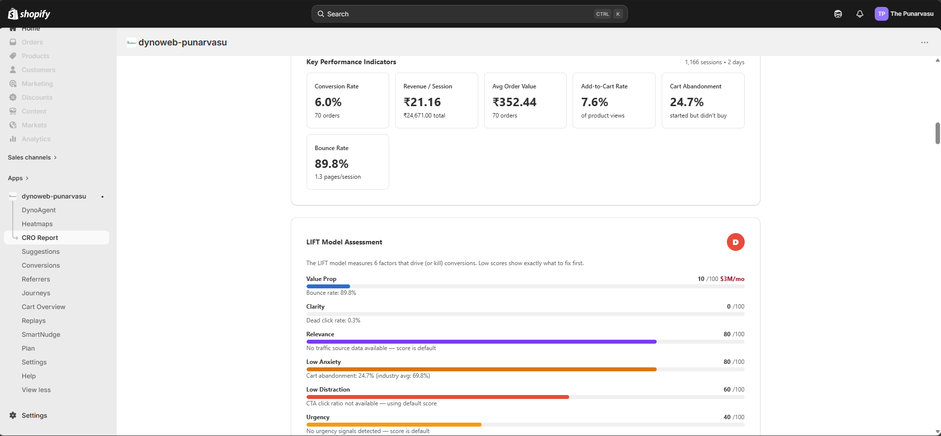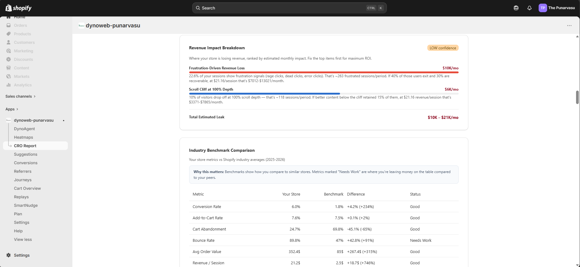 CRO Report turns the behavioral data DynoWeb collects into a structured, evidence-backed optimization plan, giving merchants the same depth of analysis a CRO agency would deliver — generated in minutes instead of weeks.