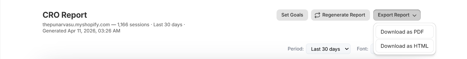 Before generating a report, the Goals step asks the merchant to set two or three KPI targets — conversion rate, average order value, revenue per session, or any of the thirteen tracked metrics. These targets anchor the report: every section shows progress toward the goals, and the suggestion engine prioritizes fixes that move the needle on the metrics that matter most.