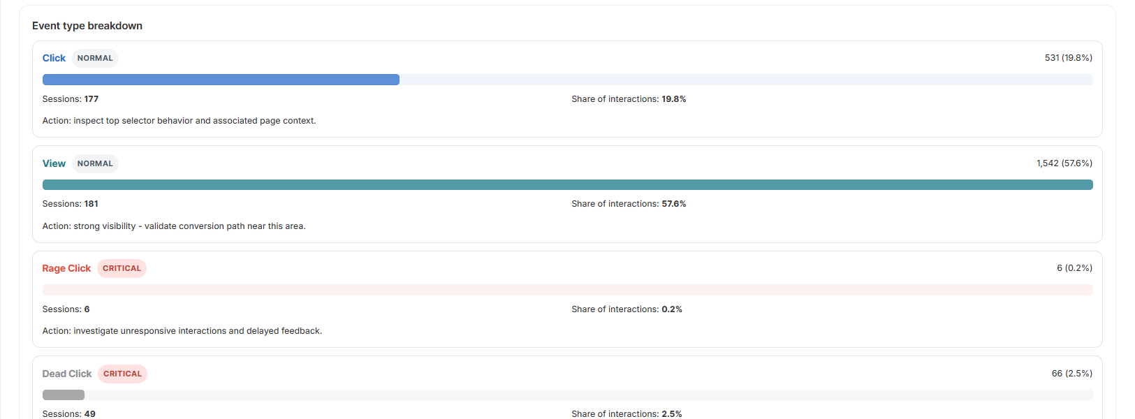 This row breaks activity down by event type, such as clicks, views, rage clicks, dead clicks, error clicks, and gesture events.