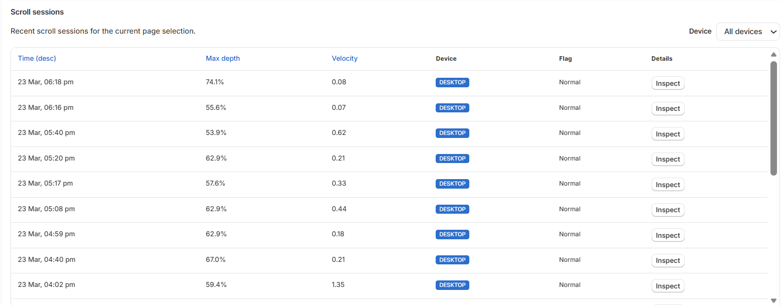 This row shows recent scroll-session data for the selected page.