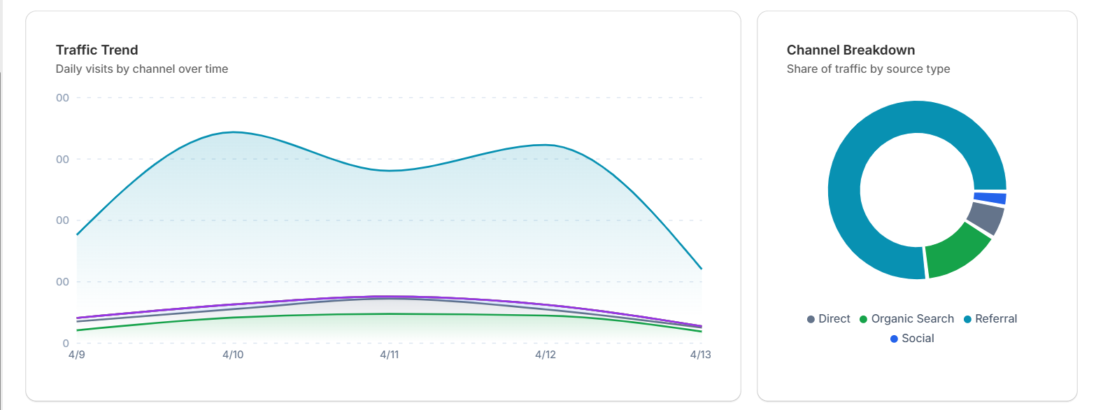 The traffic dashboard shows an at-a-glance view of where visitors are coming from, how traffic volume is trending over time, and which channels dominate the mix. Four KPI cards, a daily trend chart, and a channel breakdown donut chart give an immediate read on acquisition health.