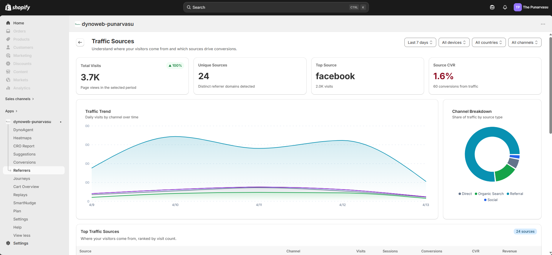 Referrers turns the traffic data DynoWeb collects into a clear acquisition map, showing merchants not just where visitors come from but which sources are worth investing in — measured by the conversions and revenue they actually produce.