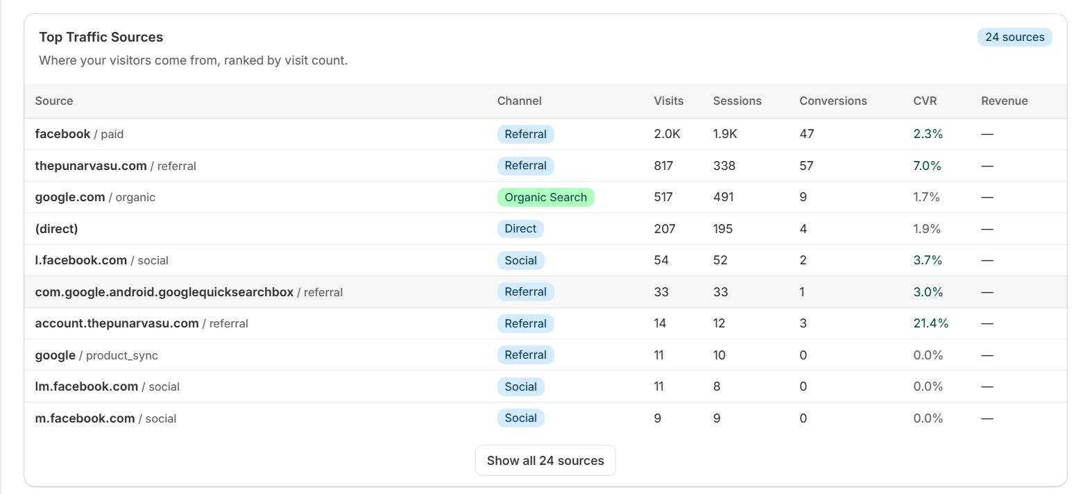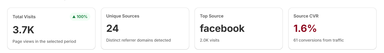 Check the Source CVR card. If overall conversion rate is low, switch to the sources table and sort mentally by CVR. Sources with high visits but near-zero conversion are sending the wrong audience. Sources with high CVR but low volume are underinvested.