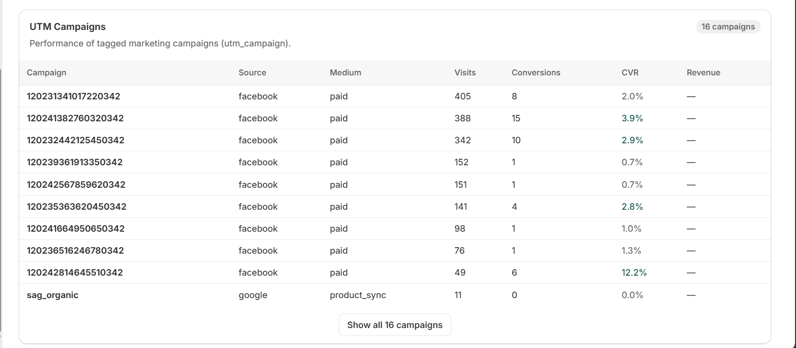 For paid campaigns, the UTM campaigns table is the single source of truth. Compare campaign CVR and revenue against ad spend (tracked externally) to calculate return on ad spend. Campaigns with visits but no conversions should be paused or retargeted.