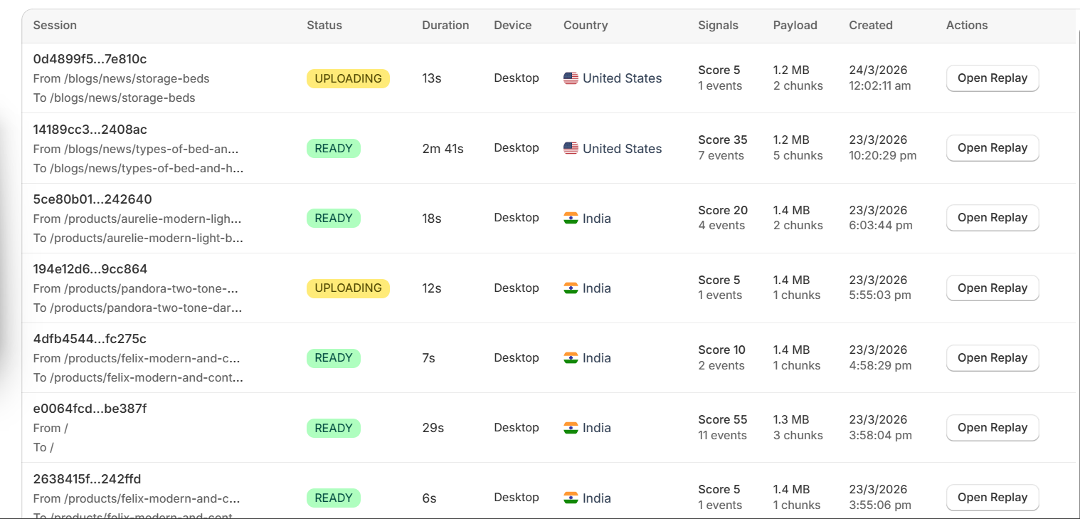 The Replays page helps users inspect real storefront visits one session at a time.