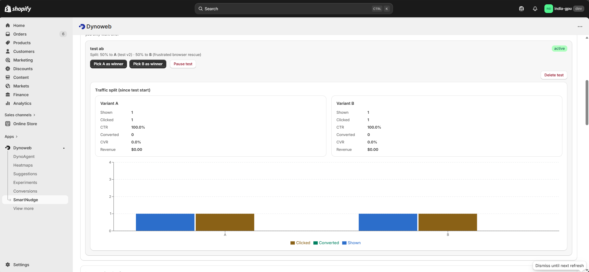 Active interventions can be placed into an A/B test to compare two variants — different copy, different components, or different trigger timing — against each other. Results are tracked in the SmartNudge dashboard with conversion metrics per variant.