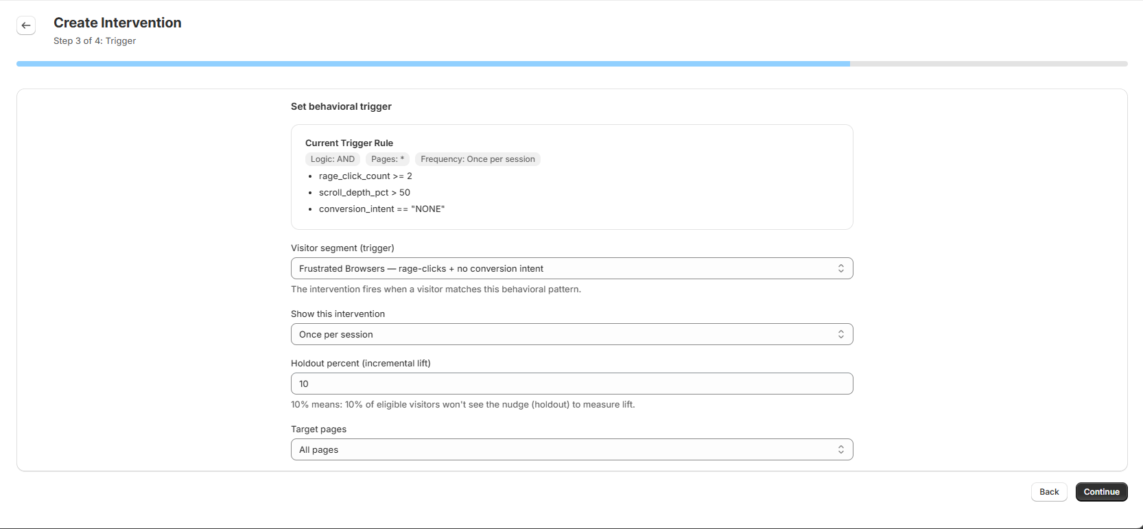 - Intervention name — an internal label only visible in the dashboard, never shown to visitors.